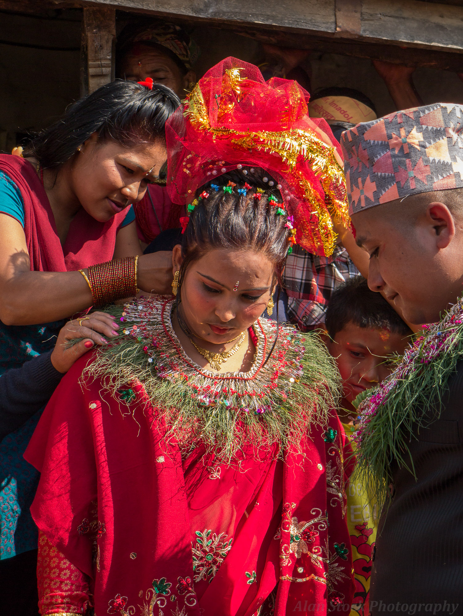 alanstockphotography-1090632 Published September 17, 2016 at 1502 × 2000 in Photo Documentary – Karmidanda – Nepalese Mountain Village The bride gets her own decorations during the ceremony