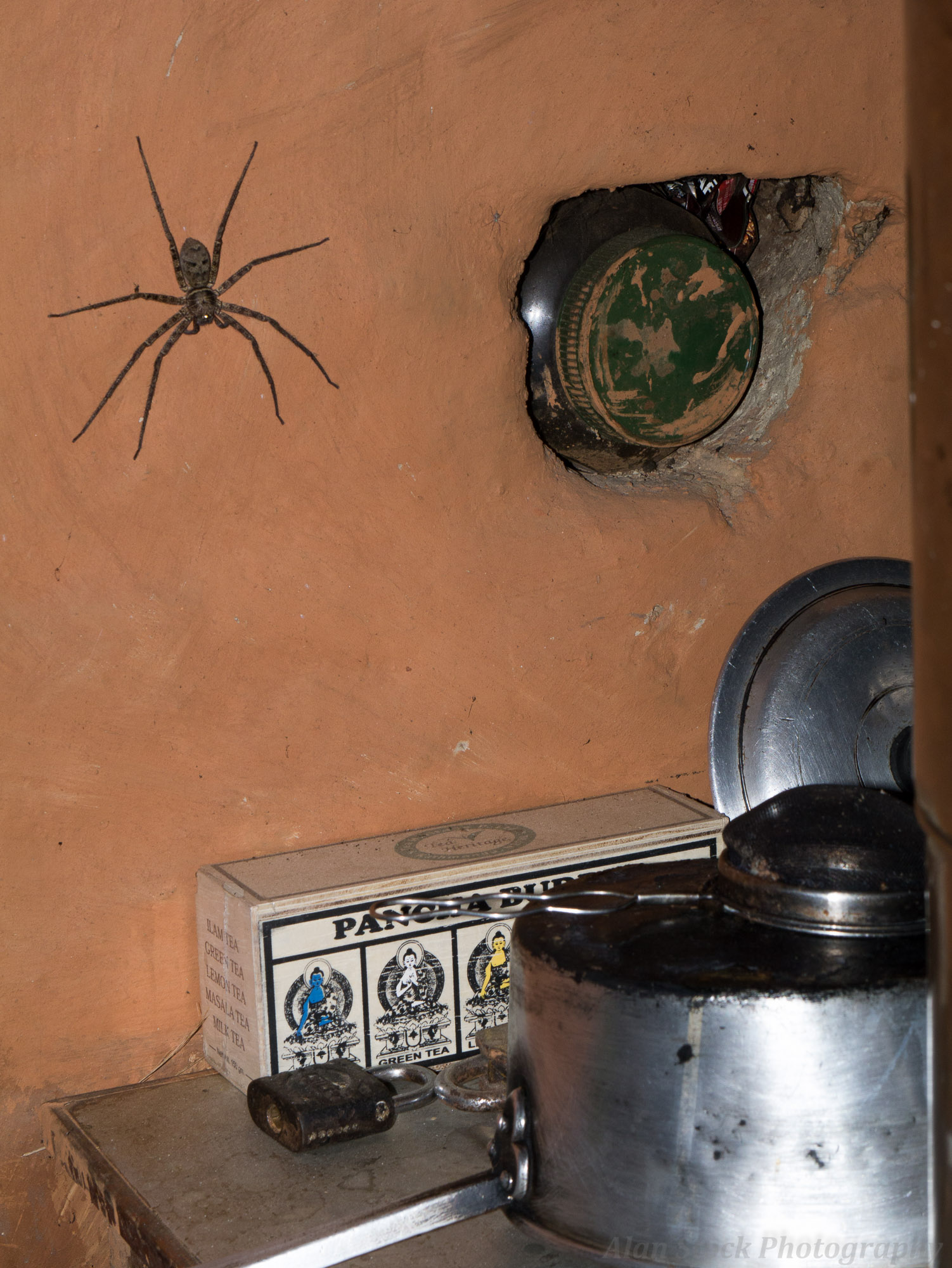 alanstockphotography-1090727 Published September 17, 2016 at 1502 × 2000 in Photo Documentary – Karmidanda – Nepalese Mountain Village In the kitchen this huntsman was a regular visitor, good job I’m not scared of spiders…